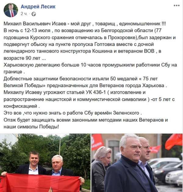 «На обратном пути эти 50 медалей были изъяты работниками Службы безопасности Украины. С Михаилом Васильевичем Исаевым в делегации была дочка создателя танка Т-34, Кошкина Татьяна Михайловна, были люди 90 лет и старше. Всех их промурыжили около десяти часов на границе, обыскивая машину, угрожая. Вменяют статью 436 часть 1», — сообщил глава ОПЗЖ в Харькове Андрей Лесик.