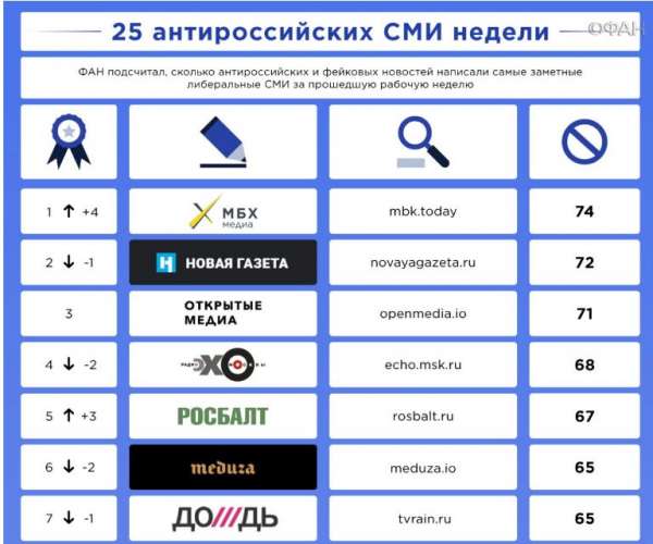 На первой строчке в который уже раз расположилось издание «МБХ Медиа», принадлежащее беглому олигарху Михаилу Ходорковскому. За прошедшую неделю оно опубликовало 74 антироссийских статьи. Ненамного от него отстала «Новая газета» - эта информационная помойка отметилась 72 материалами, порочащими Россию. На третьем месте расположились «Новая газета» — 71 статья.