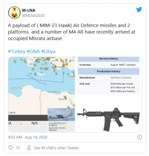 Согласно сообщению, на борту военно-транспортного самолета, прибывшего на авиабазу в Мисурате, находилась боевая техника, а также ракеты ПВО MIM-23 Hawk и автоматические карабины M4 AR, произведенные в США.