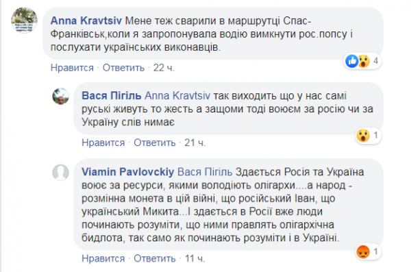 «Меня тоже ругали в маршрутке Спас — Франковск, когда я предложила водителю выключить российскую попсу и послушать украинских исполнителей», — посетовала львовянка Anna Kravtsiv.