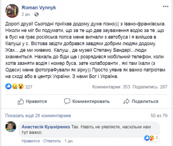 «Дорогие друзья! Сегодня приехал домой очень поздно из Ивано-Франковска. Никогда бы не мог подумать, что за то, что сделал замечание водителю за то, что в бусе играет русская попса, меня выгнали из автобуса, и я вышел в Калуше, в с. Вестовая. Оттуда добрался благодаря добрым людям домой», — сообщил он, не в состоянии эмоционально оправиться после случившегося.