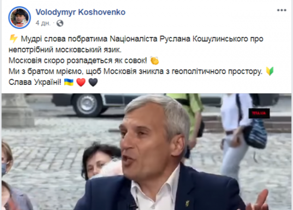 «Московия скоро распадётся как совок! Мы с братом мечтаем, чтобы Московия исчезла с геополитического пространства», — заявил Кошовенко.
