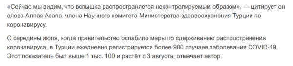 Цифры статистики, конечно, пугают, но под палящим солнцем плохие мысли как-то очень быстро улетучиваются. Людям просто надоело бояться и очень хочется отдохнуть от затворничества и всеобщей паранойи. В этом с радостью готовы помочь курорты Турецкой республики, ведь доход от туризма этот страх нивелирует. Однако, обозреватель Мухаррем Сарыкая, ссылаясь на экспертов в области здравоохранения, сигнализирует о серьезнейшей угрозе.