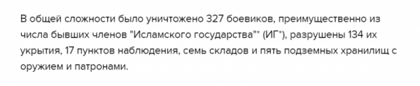 Авиация ВКС РФ и ВВС Сирии, а также артиллерия и силы специального назначения устроила зачистку в Сирийской пустыне на границе провинций Хомс и Дейр-эз-Зор.