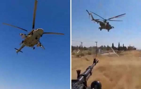 В Сети появилось видео, как транспортно-штурмовой вертолет Ми-8АМТШ ВКС России завис над наземным патрулем американских военных в провинции Эль-Хасака на северо-востоке Сирии.