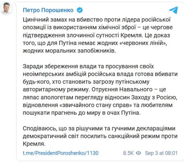 «Циничное покушение на убийство против лидера российской оппозиции с использованием химического оружия — это очередное подтверждение преступной сущности Кремля. Это доказательство того, что для Путина нет никаких «красных линий», никаких моральных предохранителей».