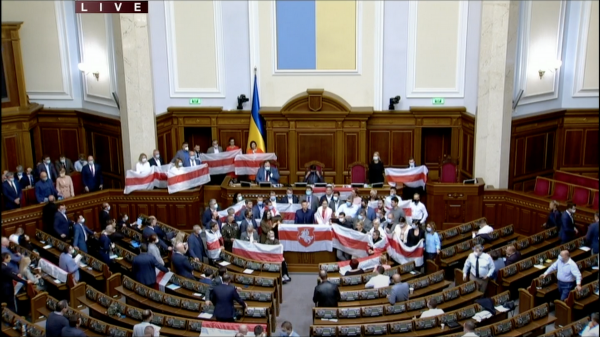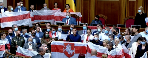 После этого спикер парламента Дмитрий Разумков призвал отказаться от любых белорусских знамен в угоду украинскому флагу.