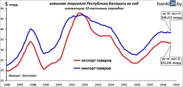 Белорусский экспорт составляет не 33, а примерно 28 миллиардов долларов. Таким образом, Белоруссия имеет дыру в торговом балансе в размере 10 миллиардов долларов, что для страны с такими экономическими и демографическими параметрами является катастрофой. Также нельзя не отметить, что белорусский экспорт критически зависит от России, ведь более 45 процентов белорусского экспорта приходится на Россию, а в макроэкономике зависимость более чем на 15 процентов называется критической.