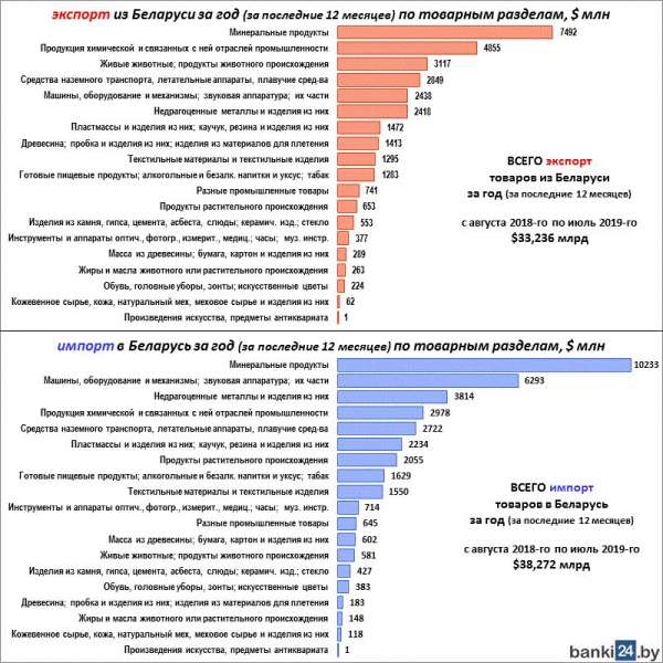 Импорт России из Белоруссии за 2019 год составил 12,8 миллиарда долларов. Из них пищевые продукты (вместе с украинской и европейской санкционкой) ― 32,92 проц. (4,21 миллиарда долларов), машины и оборудование ― 29,45% (3,76 миллиарда долларов), продукция химической промышленности ― 12,49 проц. (1,59 миллиарда долларов), металлы и изделия из них ― 7,38 проц. (0,94 миллиарда долларов), минеральные продукты ― 1,84% (0,23 миллиарда долларов).