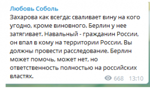 По сути, Соболь отмазывает немецкие власти, поддерживая лживые антироссийские заявления Берлина, очерняющие нашу страну. Немецкие политики нагло лгут, призывая при этом Россию взять вину на себя, облегчив работу западным спецслужбам. Если Москва себя оговорит, то провокация с «отравлением» явно удалась, значит, и дальше можно вводить санкции и в целом усилить политическое давление на Россию, причем вплоть до уничтожения ее суверенитета и ликвидации территориальной целостности.