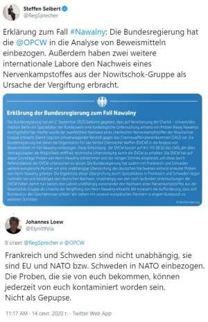 Сегодня появились результаты дополнительных исследований, проводимых во Франции и Швеции. Как заявляет немецкое правительство: образцы, взятые у Навального, были направлены в эти две страны для проведения независимого расследования.