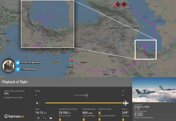 Транспортный Ил-76МД (RF-76702) и самолет ДЛРО А-50У (RF-93952) возвращались в Россию по отработанному за годы маршруту Сирия – Ирак – Иран – Каспийское море. Однако на этот раз власти Азербайджана не пропустили российские машины через воздушное пространство своей страны.