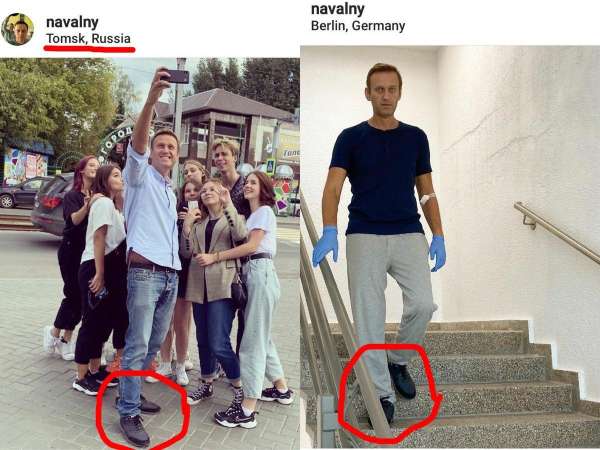 Кроме того, на одной из последних фотографий, сделанных в берлинской клинике, на блогере кроссовки, в которых он фотографировался в Томске еще до инцидента с отравлением.