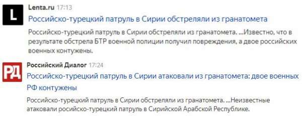 «Лента.ру» и ряд других российских СМИ ничтоже сумняшеся опубликовали новости с заголовками «Российско-турецкий патруль в Сирии обстреляли из гранатомета», «Российские военные пострадали при обстреле в Сирии» и тому подобное.