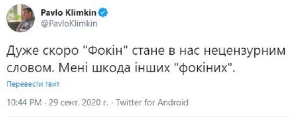 «Фокин —седовласый дед 1932 года рождения, который на фоне самого младшего депутата 1990 года рождения, присутствовавшего на заседании комитета Рады, выглядит реликтом из прошлой эпохи. Неким старым 27-метровым диплодоком, вокруг которого суетилась стая мелких, 70-см в холке, велоцирапторов. Они бы и рады съесть Фокина, но ни не могут даже укусить.