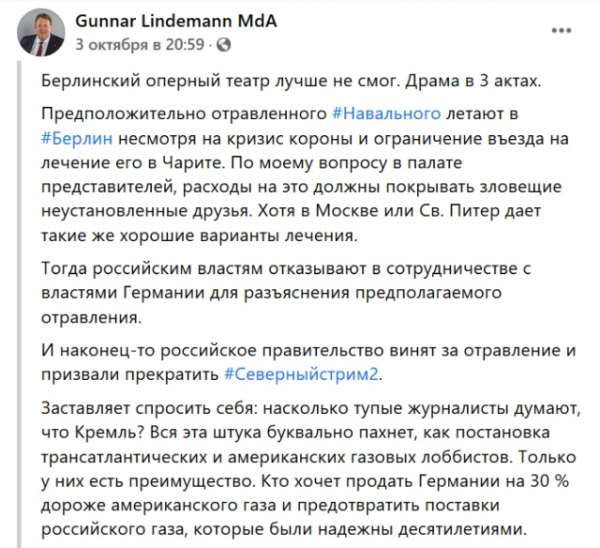 Член Палаты депутатов Берлина Гуннар Линдеманн считает, что к отравлению «совершенно ничтожного человека в России и для неё» Алексея Навального, причастны США, преследуя цель — сорвать строительство газопровода «Северный поток-2».