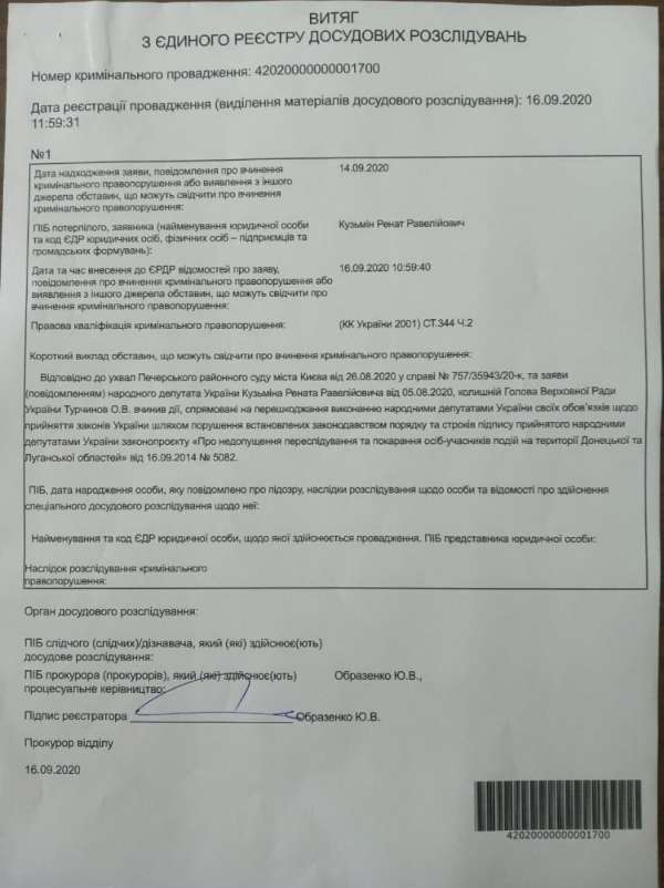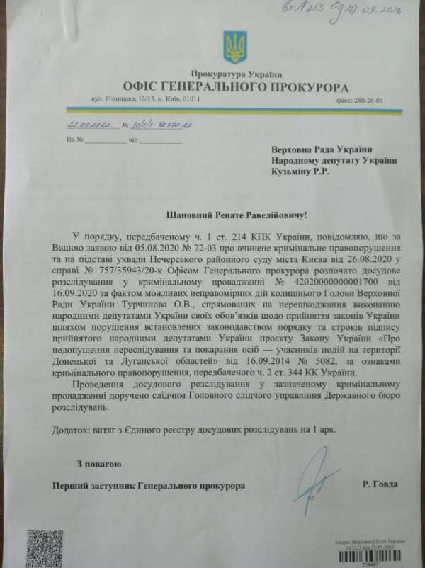 Об этом сообщил народный депутат от «Оппозиционной платформы – За жизнь», экс-заместитель Генпрокурора страны Ренат Кузьмин в Facebook.