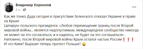 «Как же тонко Дуда сегодня в присутствии Зеленского отказал Украине в праве на Крым! Цитирую польского президента: «Любое перемещение границ после Второй мировой войны... является недопустимым, международное сообщество никогда не может на это согласиться, и я надеюсь, не будет на это соглашаться», - отметил Корнилов.