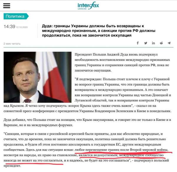 Напомним, президент Польши Анджей Дуда находится на Украине с официальным визитом с 11 октября. Сегодня он вместе с коллегой Владимиром Зеленским подписал в Киеве ряд документов. В совместном заявлении двух президентов, в частности, значится, что Польша поддерживает территориальную целостность Украины, а также «выражает заинтересованность» во взаимодействии с Украиной в рамках международной платформы по «деоккупации Крыма». Кроме того, стороны заверили друг друга в «стратегическом партнерстве» и выразили удовлетворение получением Украиной статуса расширенного партнерства с НАТО. Также два лидера выразили необходимость «дальнейшего развития возможностей и потенциала литовско-польско-украинской бригады имени Великого гетмана Константина Острожского». В заявлении также идет речь об важности взаимовыгодного экономического сотрудничества между странами с целью полного использования возможностей, своих рынков в контексте функционирующей углубленной и всеобъемлющей зоны свободной торговли между Европейским Союзом и Украиной.