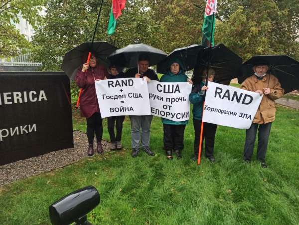 Люди, несмотря на проливной дождь, вышли с белорусскими государственными флагами под лозунгом «Руки прочь от Белоруссии». Кроме того, участники пикета скандировали: «США – это война на Донбассе, США – это война в Белоруссии!», «Американцы, вон из Белоруссии!», «Корпорация Rand –это война!».