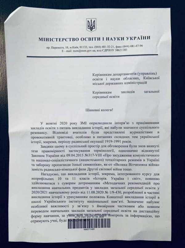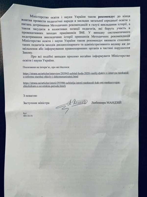 «Преподавание истории, в частности, интегрированного курса для непрофильных 10 и 11 классов «История. Украина и мир», должно осуществляться со строгим соблюдением «Методических рекомендаций о преподавании учебных предметов в учреждениях общего среднего образования в 2020/2021 учебном году» от 11.08.2020 № 1/9-430, разработанной в части преподавания истории с учетом положений Концепции преподавания истории в школе Украинского института национальной памяти. Указанное приобретает особую важность в связи с предполагаемым частичным или полным переводом учебных заведений общего среднего образования на дистанционную форму обучения, в условиях которой педагогический контроль за информацией, получаемой учениками, будет ослаблен», – написала Любомира Мандзий.