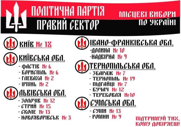 Конечно, в любом это больше, чем выдвинул, например, дышащий на ладан «Правый сектор»*. По сводным данным, опубликованным 22 октября руководством этого ультраправого движения, его представители и «побратимы» избираются в 18 местных советов по всей стране.