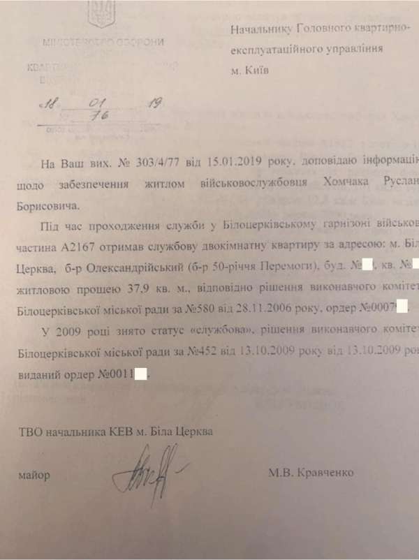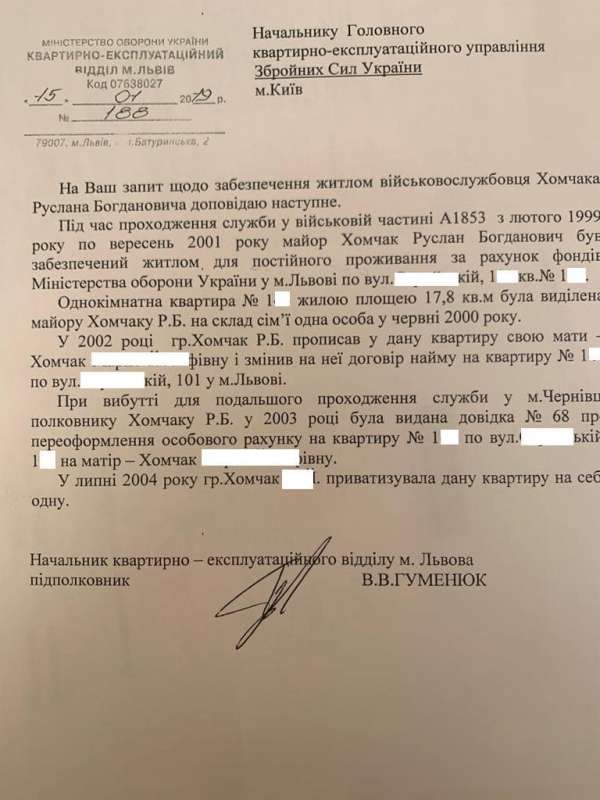 По его словам, предыдущие две служебные квартиры Хомчак приватизировал, при этом одну из них переписал на свою маму.
