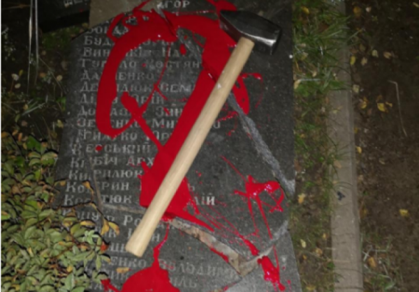 В Киеве, в Бабьем Яру неизвестные разгромили памятник украинским националистам и залили обломки красной краской, призванной символизировать кровь.