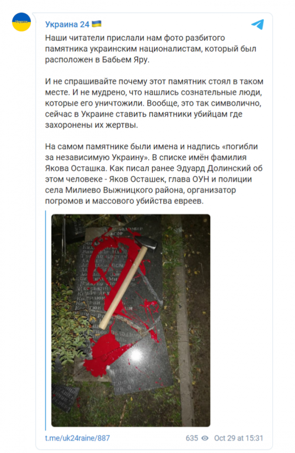 «На самом памятнике были имена и надпись "Погибли за независимую Украину". В списке имён – фамилия Якова Осташека. Как писал ранее Эдуард Долинский об этом человеке, Яков Осташек – глава ОУН и полиции села Милиево Выжницкого района, организатор погромов и массового убийства евреев», – говорится в заметке.