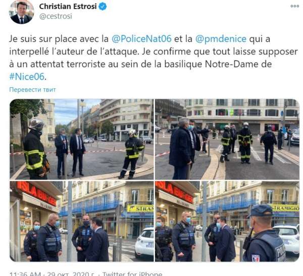 Мэр города Кристиан Эстрози написал в «Твиттере»:«Я нахожусь на месте с полицией, которая арестовала виновника нападения. Подтверждаю, что всё указывает на террористический акт в базилике Нотр-Дам-де-Ницца».