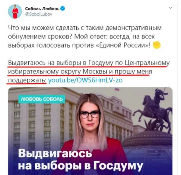 На выборах в МГД в прошлом году шоу устраивала Соболь. Именно она призывала народ выходить на улицы, якобы голодала, делала вид, что вот-вот умрет за свободу слова. Это был пиар-ход, который провалился.