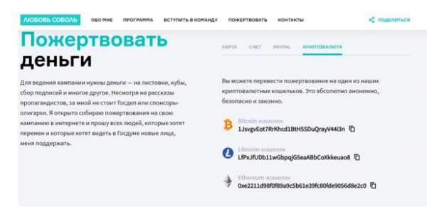 Поэтому после своего заявления Люба тут же создала три криптокошелька для пожертвований на свою кампанию - Bitcoin, Litecoin, Ethereum. Вот только по данным сайтов, всего за восемь месяцев она собрала всего 60 030 рублей.