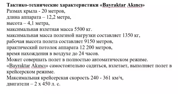Также не исключается оснащение "Bayraktar Akıncı" моторами мощностью 750 л. с. – из того же семейства двигателей на базе АИ-450 или двигателями национальной турецкой разработки мощностью 240 л. с.