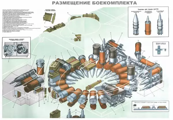 Но 22 снаряда это не придел для Т-72… Внутри корпуса есть множество мест неавтоматизированного хранения. В основном это баки-стеллажи. Они находятся за одним из фронтальных топливных баков в горизонтальной укладке, вертикальная за вторым лобовым баком и один большой бак-стеллаж за автоматом заряжания с вертикальным размещением снарядов и зарядов. Сразу за ним находится перегородка, отделяющая боевой и моторный отсек. И да – в башне предусмотрены два крепления для снаряда и заряда, но ими, как правило, не пользуются.