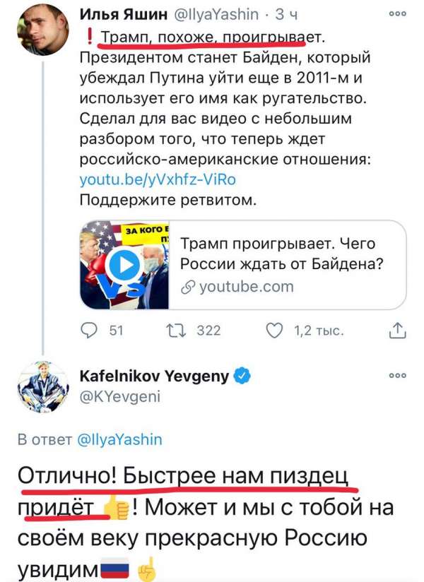 «Трамп, похоже, проигрывает. Президентом станет Байден, который убеждал Путина уйти еще в 2011-м и использует его имя как ругательство», – написал в «твиттере» либеральный политик Илья Яшин.