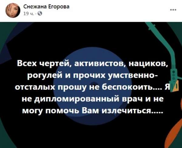 «Всех чертей, активистов, нациков, рогулей и других умственно отсталых прошу не беспокоить. Я не дипломированный врач и не могу помочь вам вылечиться», - заявила телеведущая.