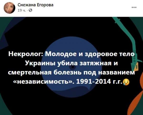«Некролог: молодое и здоровое тело Украины убила затяжная и смертельная болезнь под названием "независимость". 1991-2014 г.г.», — написала Егорова.