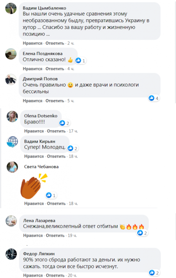 «Вы нашли очень удачные сравнения этому необразованному быдлу, превратившись Украину в хутор. Спасибо за вашу работу и жизненную позицию», -отметил, в частности, блогер Вадим Цымбаленко.