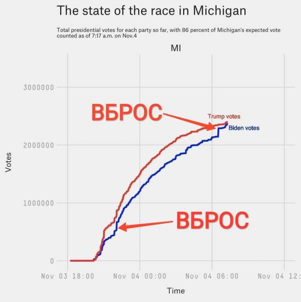 И несмотря на приличный отрыв Трампа от Байдена в Висконсине и в Пенсильвании, разрыв с этими почто-вбросами под прикрытием ночи начал стремительно сокращаться. А в Висконсине вообще объявили победу Байдена с мизерным разрывом. Видимо, вбросили ровно столько, чтобы победить. По Висконсину мы вообще в ближайшее время выложим материал, который многое всем объяснит, почему сейчас вокруг него ломаются копья (см. ниже).