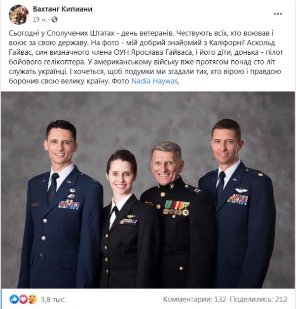 «В этот день чествуют всех, кто воевал и воюет за свое государство. На фото - мой хороший знакомый из Калифорнии Аскольд Гайвас, сын выдающегося члена ОУН Ярослава Гайваса, и его дети, дочь - пилот боевого вертолета. В американской армии уже в течение более ста лет служат украинцы. И хочется, чтобы мысленно мы вспомнили тех, кто верой и правдой защищал свою великую страну», - заявил он.
