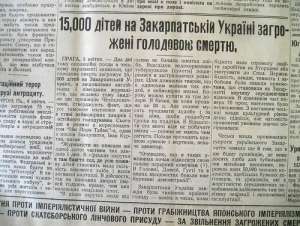 "Два дня тому назад оппозиционные депутаты в чешском парламенте заявили, что голодная смерть угрожает 15000 детей на Закарпатской Украине, а сообщения английских и немецких журналистов, которые недавно посетили эту провинцию Чехословакии, подтверждают факт, что всё тамошнее население живёт в состоянии невероятной бедности и невероятного голодания".