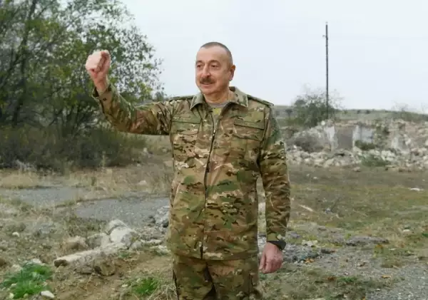 Президент Азербайджана Ильхам Алиев демонстрирует победный жест во время посещения возвращенных территорий Нагорного Карабаха.