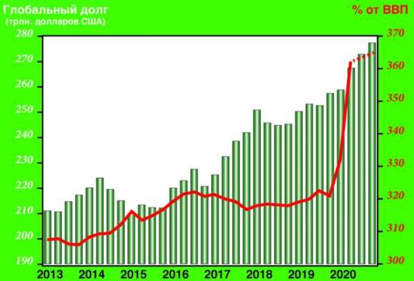 По итогам 2020 года объем глобального долга достигнет рекордного значения 277 трлн долл., составив, по оценкам IIF, 365% мирового ВВП. Увеличение долговой нагрузки подстегивалось пандемией и связанными с ней государственными и корпоративными программами стимулирования. Долговая нагрузка развитых государств, по расчетам аналитиков, уже превышает 430% их совокупного ВВП, а у развивающихся экономик она вплотную приблизилась к 250% ВВП.