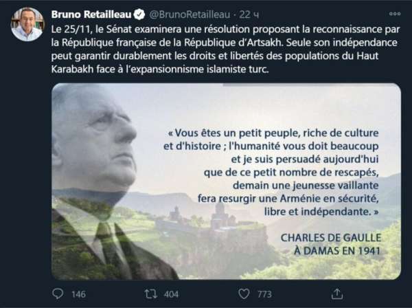 Один из авторов проекта сенатор Брюно Ретайо (руководитель фракции «Республиканцы») сообщил: «25 ноября сенат рассмотрит постановление о признании Французской Республикой Республики Арцах. Только её независимость может надежно гарантировать права и свободы населения Нагорного Карабаха перед лицом турецкого исламистского экспансионизма».