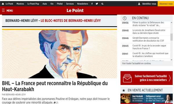 Гарантировать свободу Арцаха, по мнению Бернара-Анри Леви, должен международный военный контингент. Леви вместе с Жаком Аттали оказался во главе списка 120 французских интеллектуалов и деятелей культуры, призвавших к защите Армении и Арцаха. Никого не удивляет та «странность», что раздался этот призыв лишь после того, как усилиями России были прекращены боевые действия и российские миротворцы вошли в Карабах.