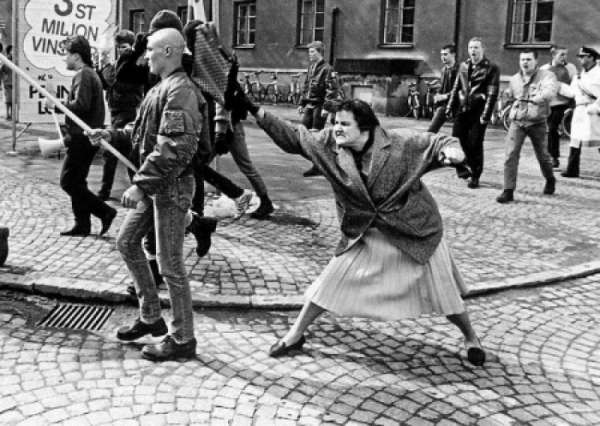 А в социал-демократической Швеции все шло своим чередом: левые уже боролись не только за социальные права человека, но и за всевозможные извращения под видом защиты этих прав. Не так, конечно, как сейчас, когда приоритетная защита ЛГБТ-сообщества – мерило всех правозащитных движений, но начиналось все уже тогда. Шла такая демонстрация и в Векше, а противостоять ей вышло не очень большое шествие неонацистов-скинхедов, бритоголовых, в джинсах, кожаных бомберах, тяжелых ботинках и с флагами – неонацистской партии «Nordiska rikspartiet» и государственными шведскими (это чтобы полиция не трогала).