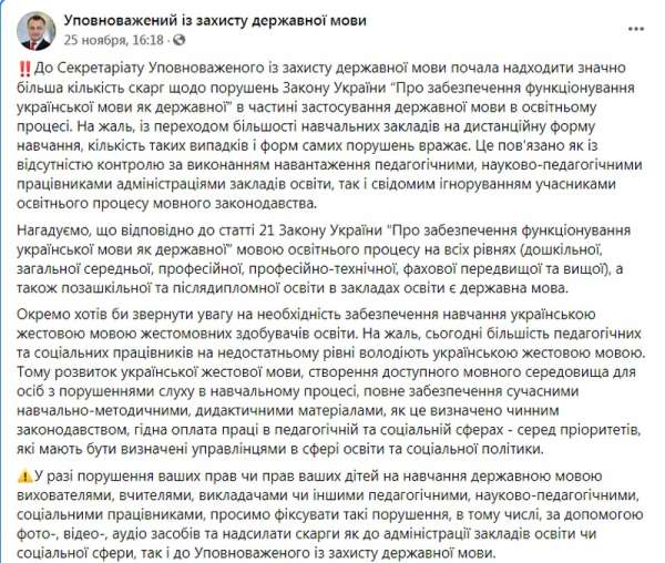 На своей странице в Facebook мовный омбудсмен сокрушается, что в связи с переходом образовательных учреждений на дистанционное обучение, его секретариат завален жалобами на нарушения Закона Украины «Об обеспечении функционирования украинского языка как государственного».