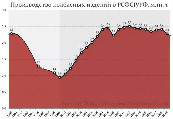 Из графика видно, что производство колбас в 1990 году составляло 2,3 млн. тонн или 15,5 кило на человека в год. К концу 90-х оно упало до 0,9 млн. тонн. С начала нулевых наблюдается резкий рост, который теперь сохраняется на уровне 2,3-2,5 млн. тонн в год, т.е. немного превосходя уровень 1990 года.