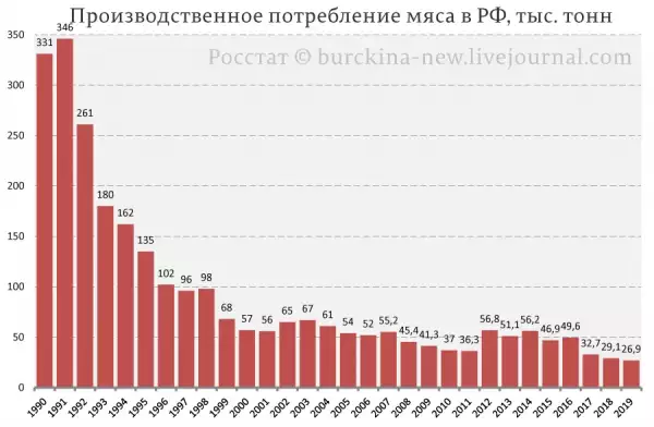Эту загадку решить не просто, а очень просто. Для понимания обратимся к разуму и к цифрам Росстата. Согласно Росстата производство колбасных изделий в России с 1990 по 2019 годы: