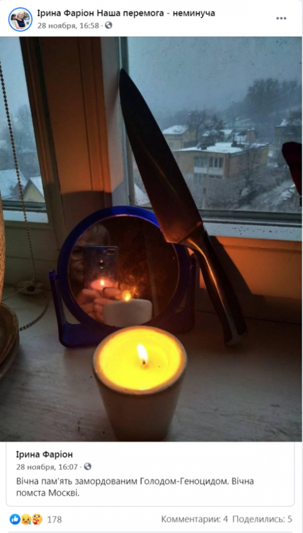 Предприняла этот акт и Ирина Фарион. Националистка выставила на своём окне свечу, присовокупив к ней нож. Соответствующую композицию Фарион запечатлела на фотоснимок, который выложила в Facebook, сопроводив его лаконичной подписью.
